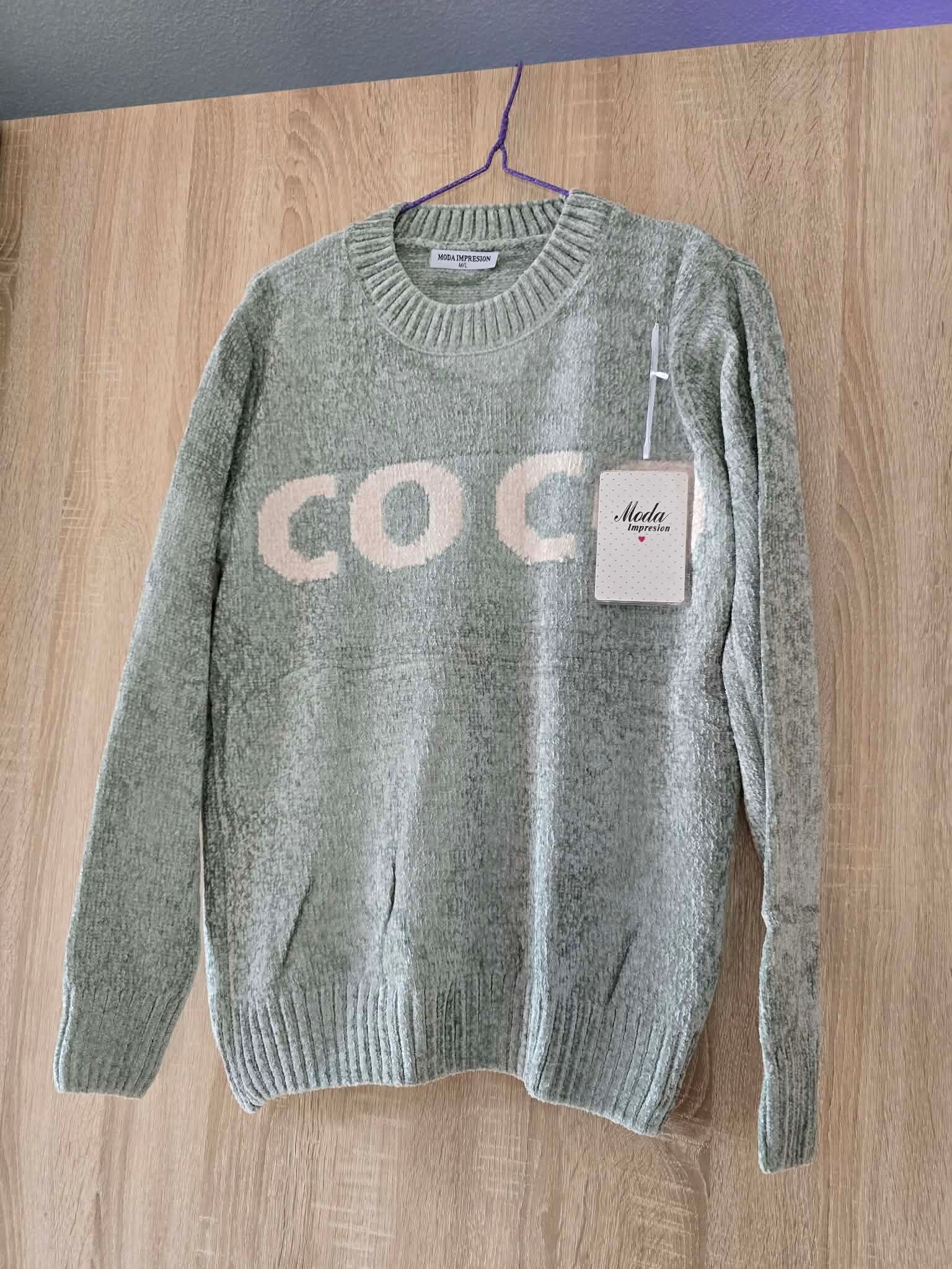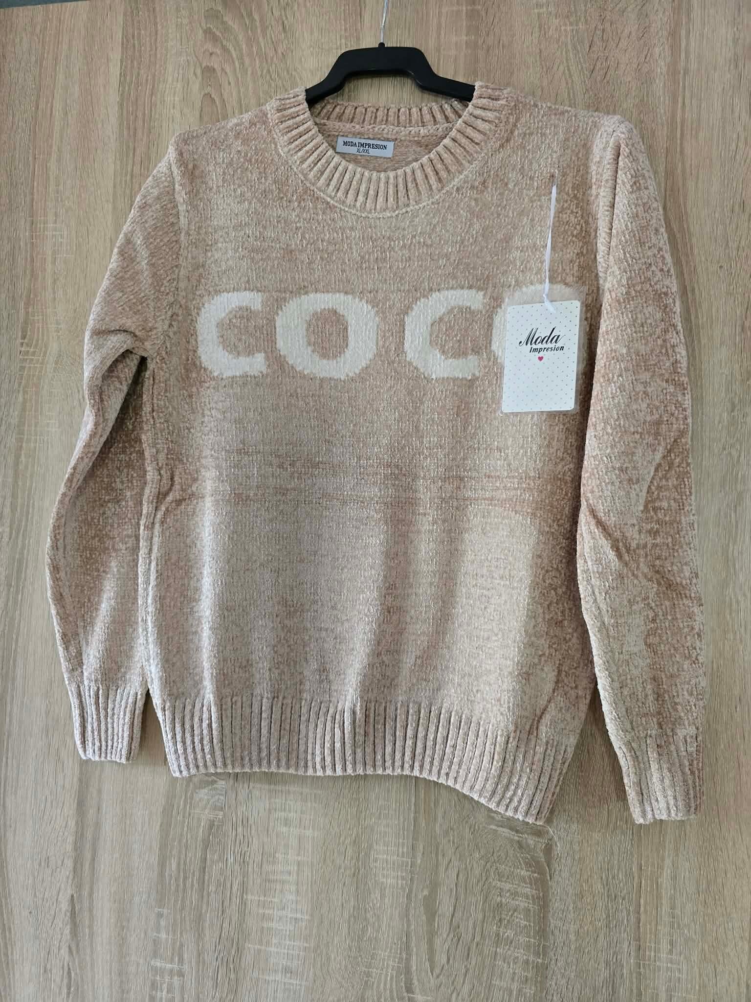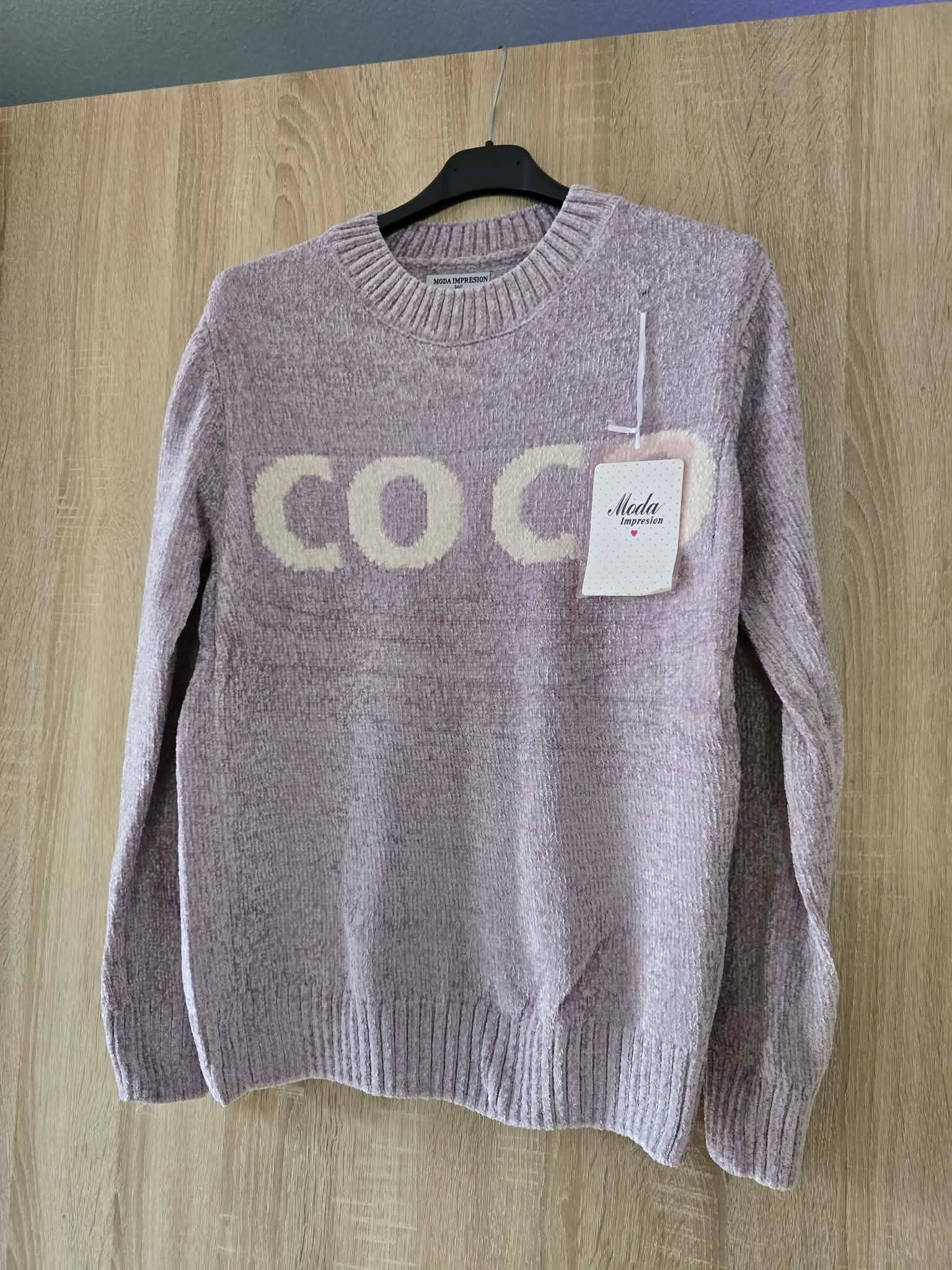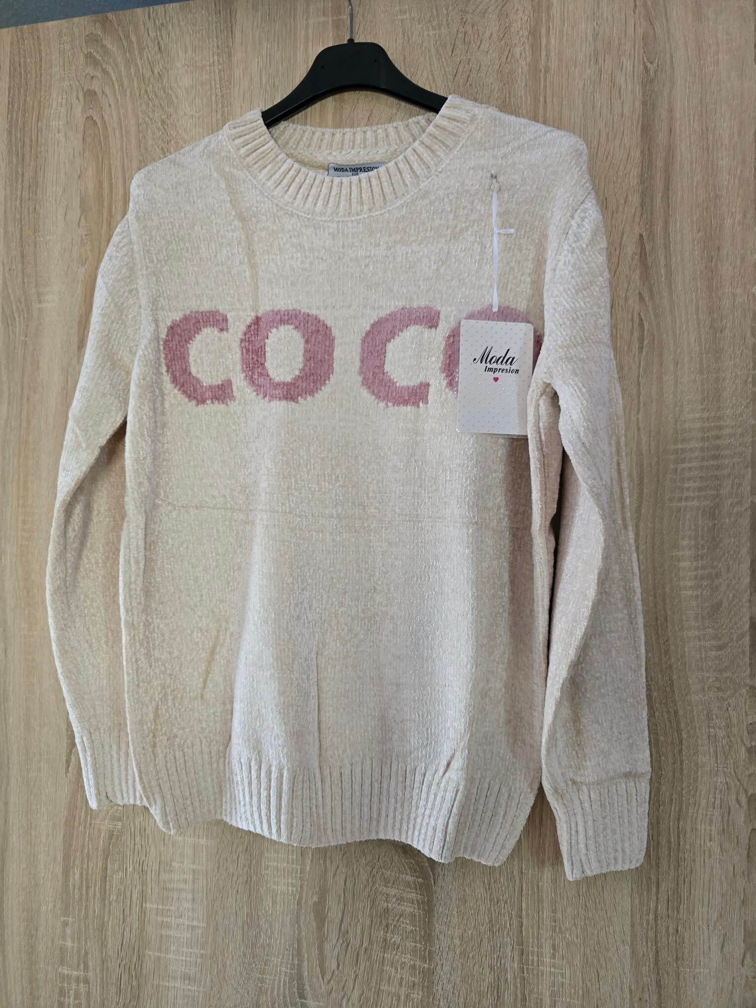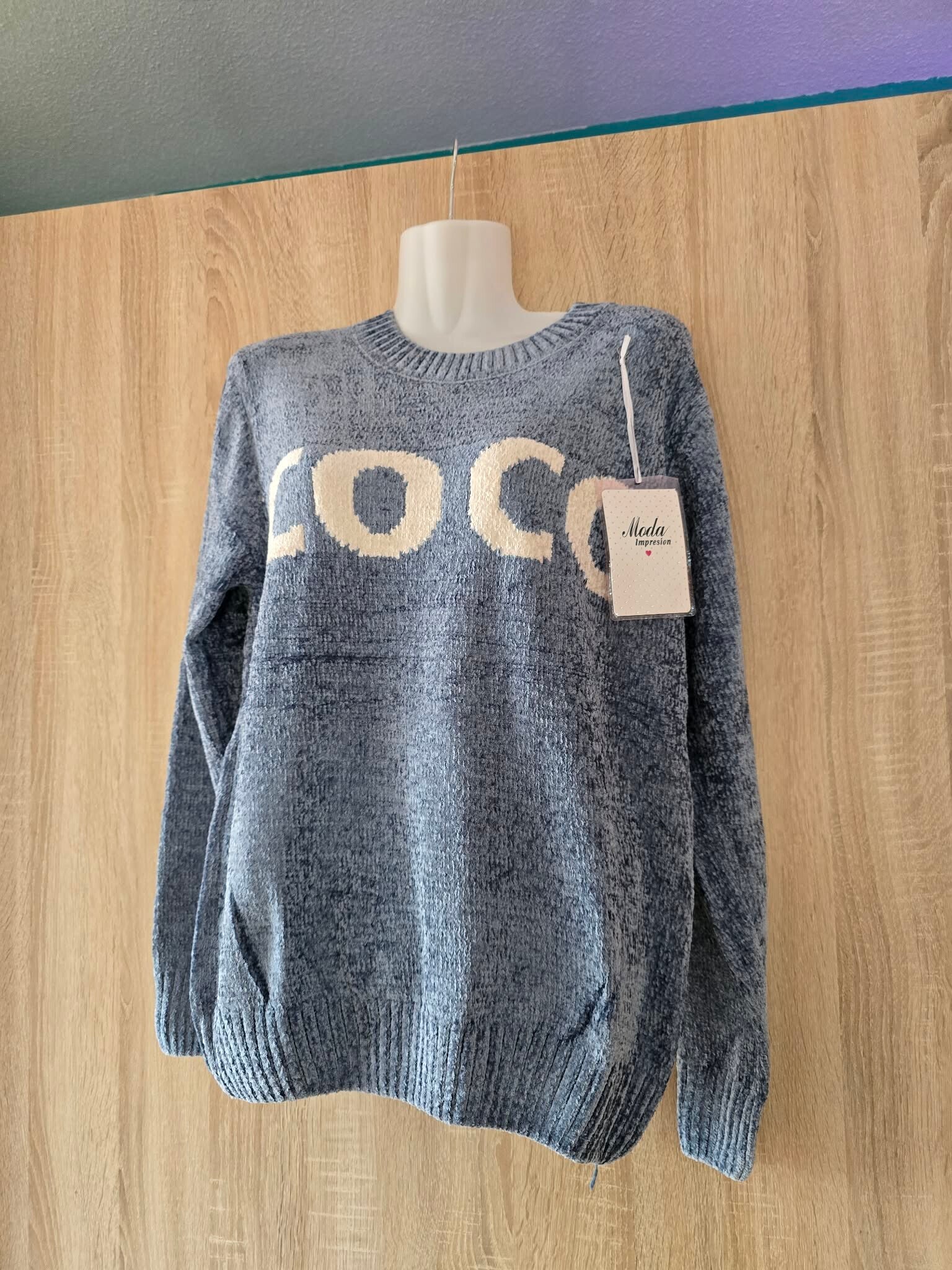 Deze blauwe chenille trui met het woord 'COCO' erop is een populair fashion item van het merk Moda Impresion.