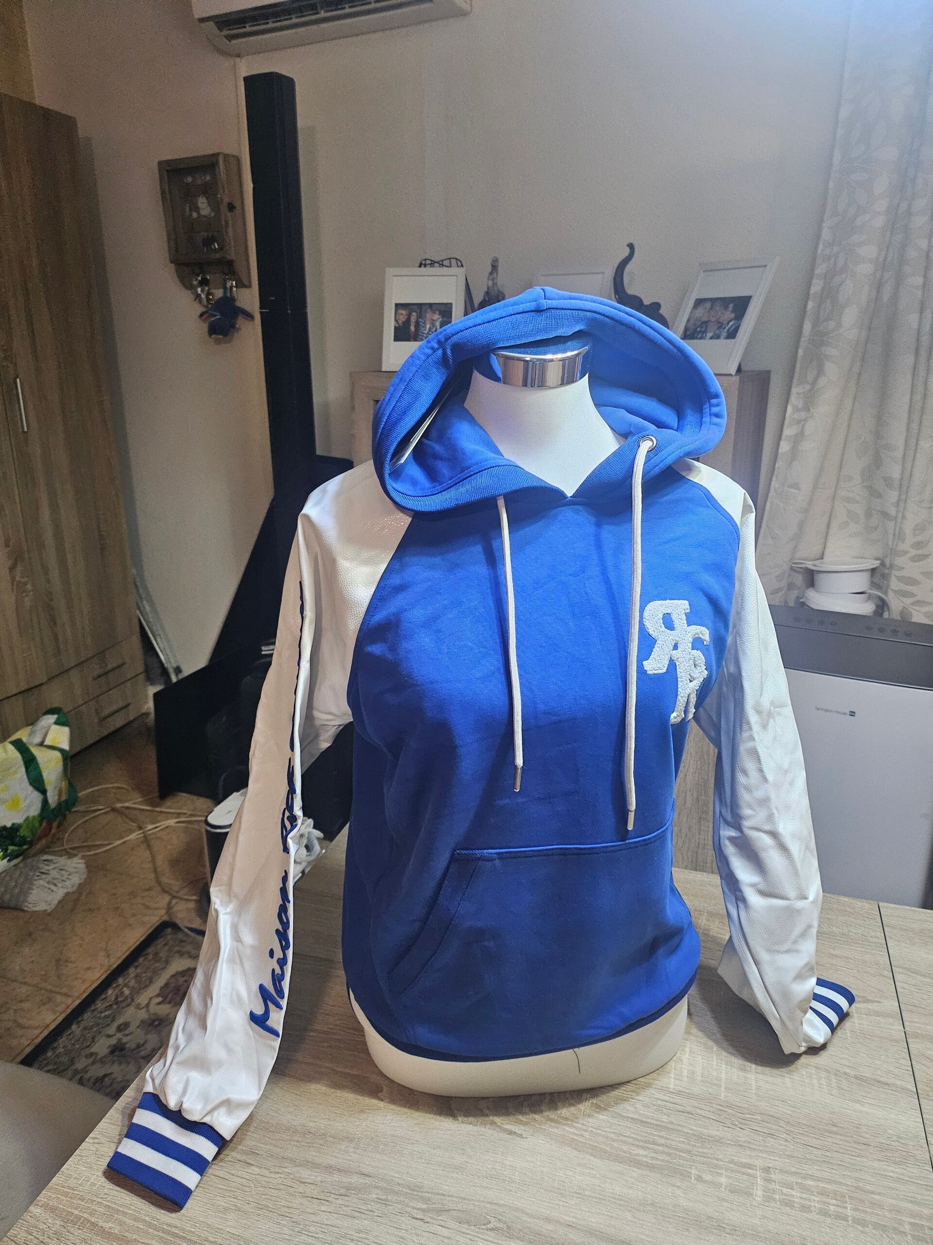 De hoodie heeft een blauwe body, witte raglanmouwen en een capuchon met witte trekkoorden. Dit type kleding is populair bij universiteits- en sportmerken zoals rich! Couture