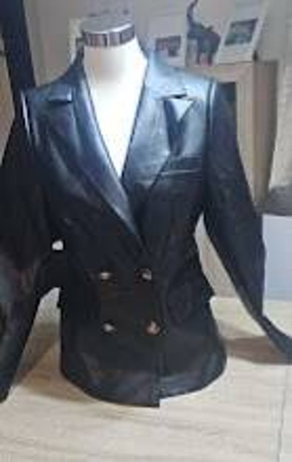 Dit item is een zwart getailleerde blazer met leereffect, vergelijkbaar met modellen van merken als RICH! COUTURE. Het is een double-breasted jasje met opvallende knopen, puntige revers en klepzakken aan de voorkant.