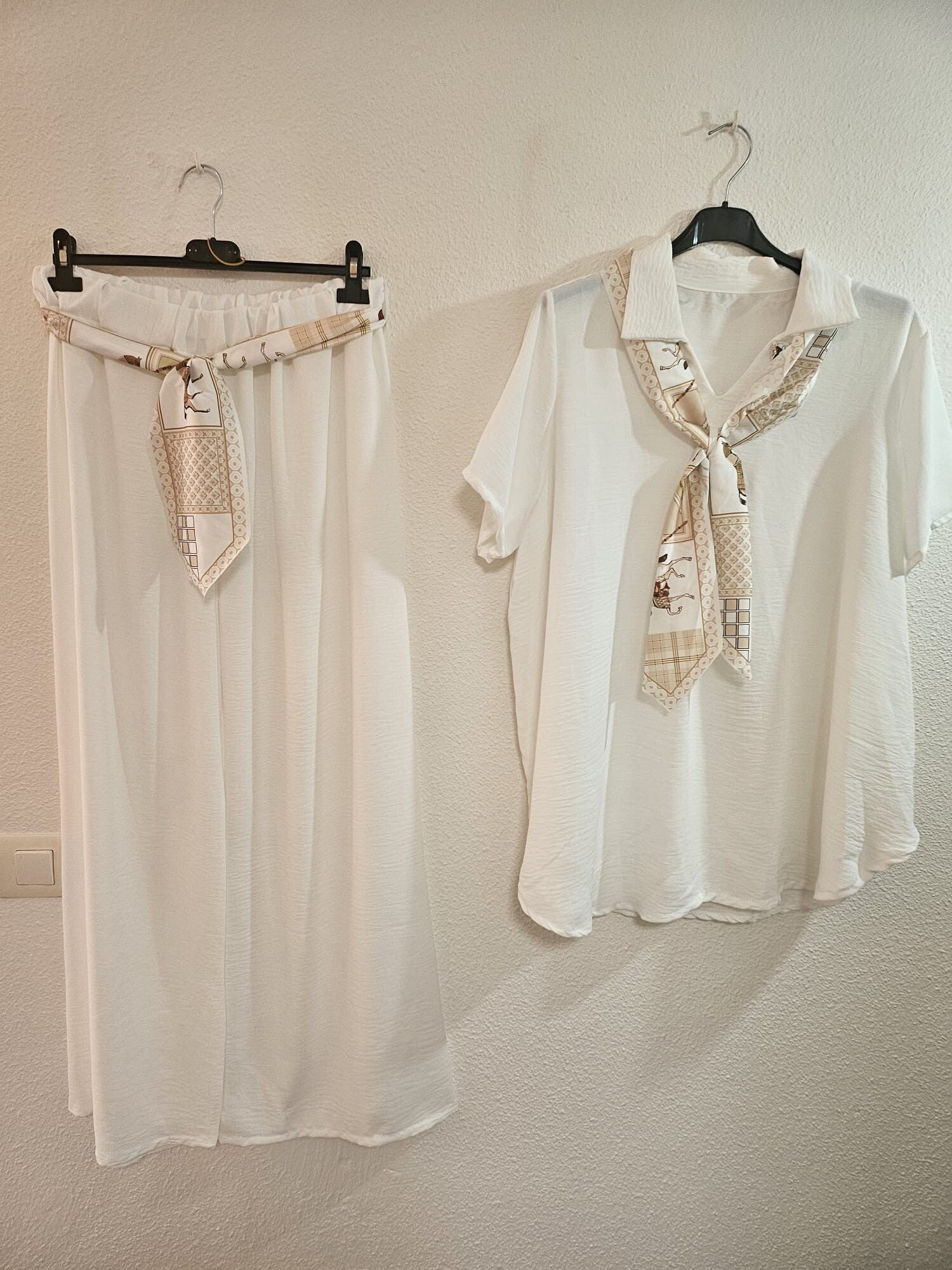 Deze elegante set bestaat uit een luchtige blouse met korte mouwen, een comfortabele wijde pantalon en een bijpassende losse sjaal bij zowel de blouse als de pantalon. De sjaal geeft de outfit een stijlvolle en speelse uitstraling en kan op verschillende manieren gedragen worden: om de hals, los geknoopt of als riem bij de pantalon.